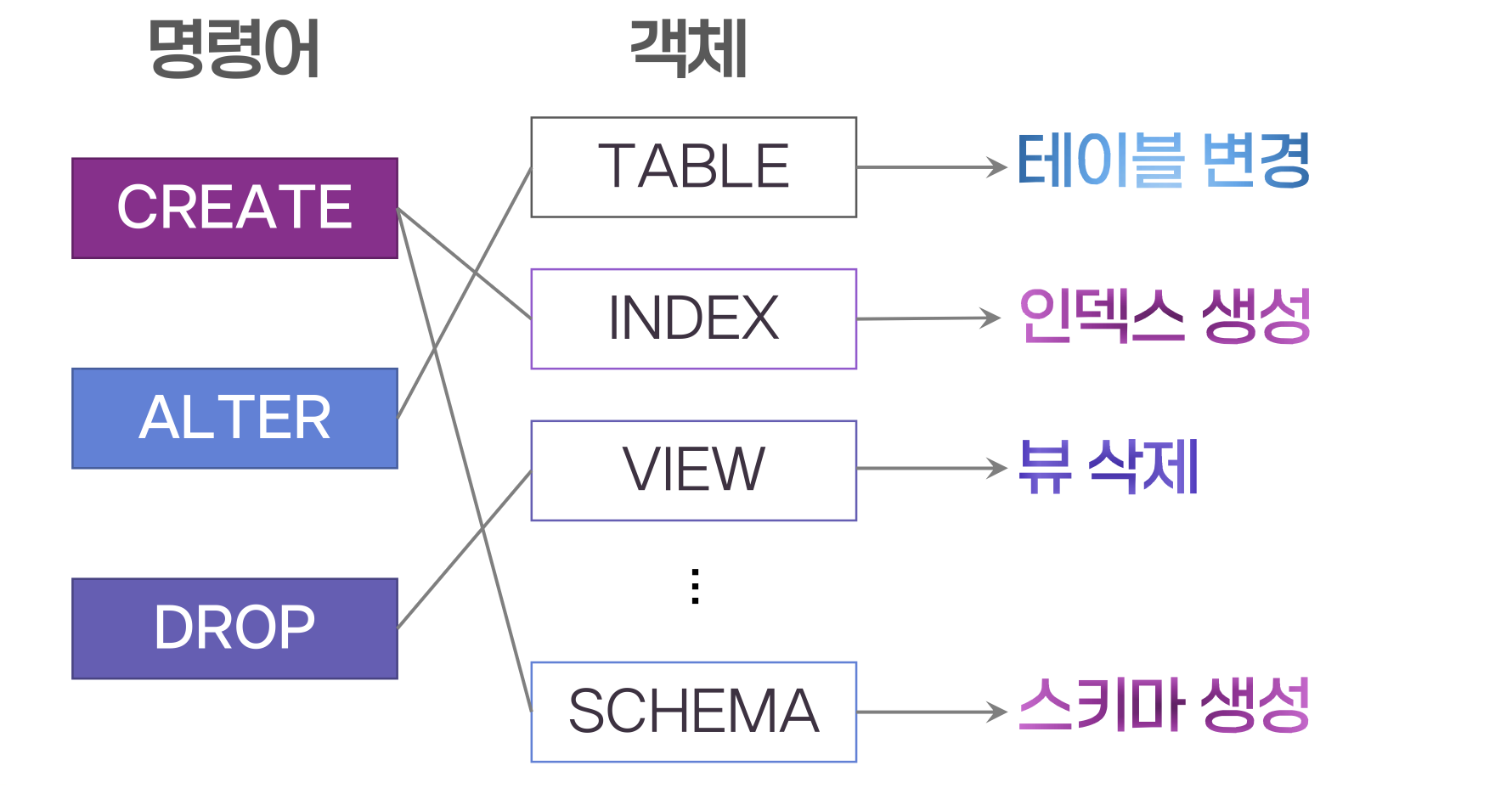 - 데이터베이스 내의 객체를 생성 및 삭제하고 그 구조를 조작하는 명령어의 집합